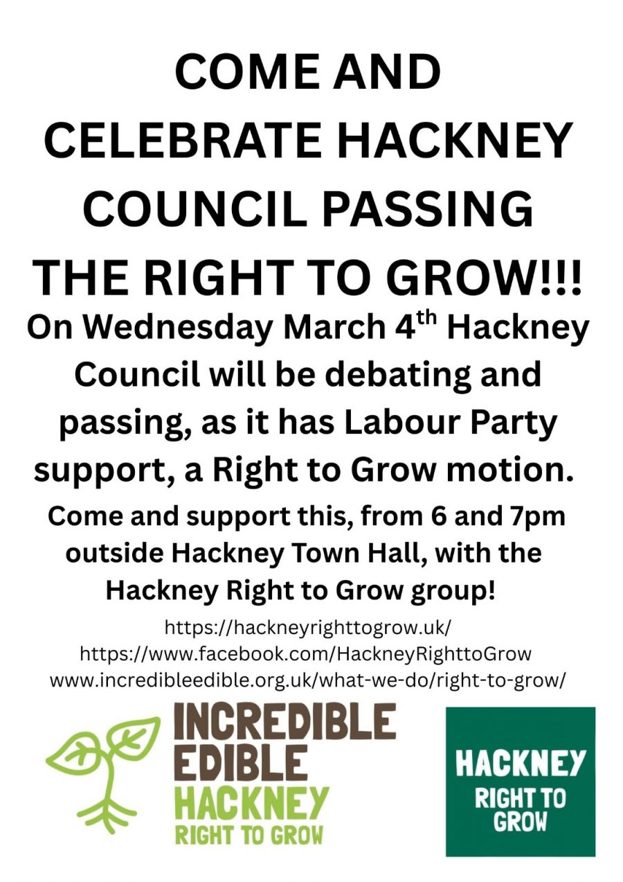Come and celebrate Hackney council passing a Right to Grow motion! Wednesday March 4th! 6-7pm…