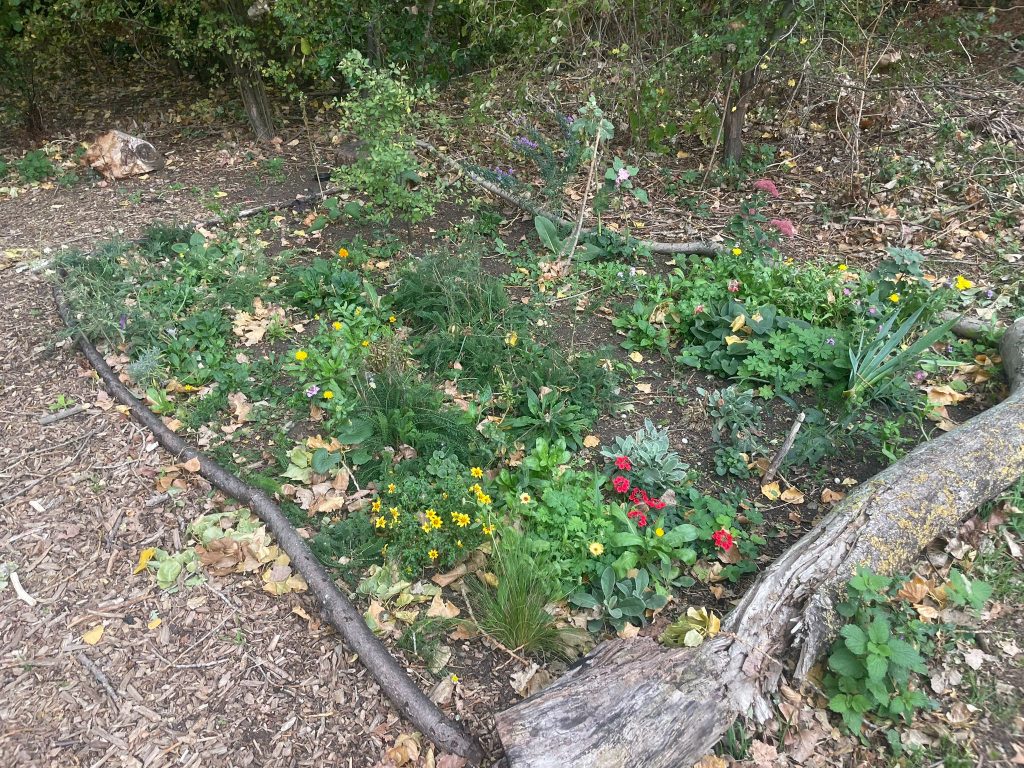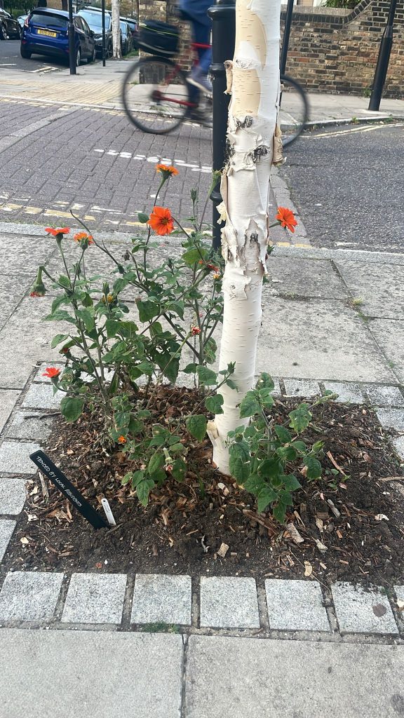 Great example of well maintained, clearly labeled residential growing on highways in tree pits and rain gardens growing both food and pollinator plants